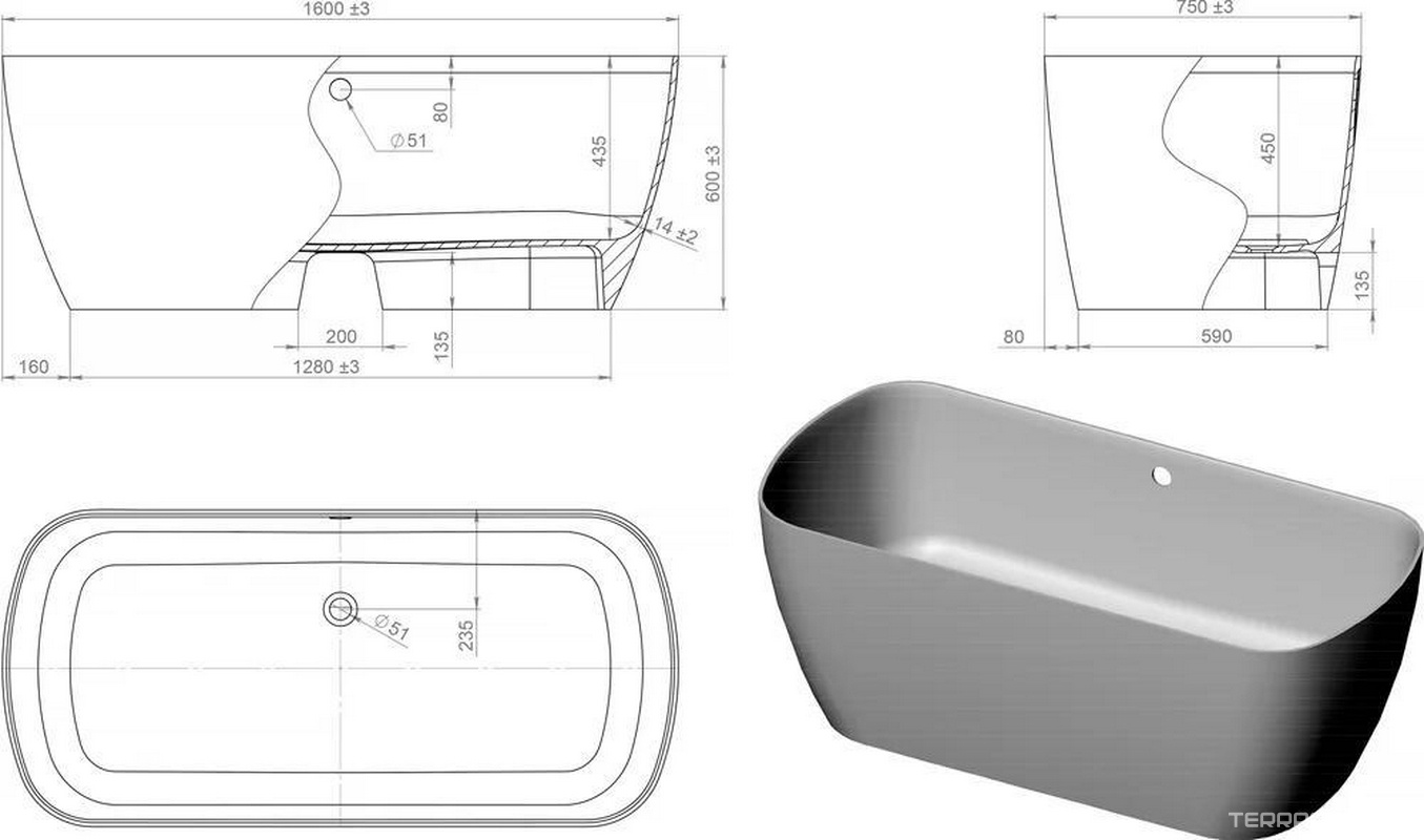 Ванна Антарес, литой мрамор 1600х750