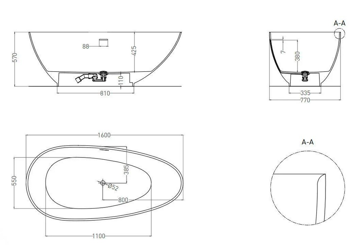 Ванна отдельно стоящая из искусственного камня Эстет Майами ФР-00006013, БЕЗ слива-перелива, ZZ